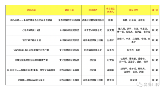 本届“挑战杯”创业计划竞赛自7月启动以来,受到全省师生的广泛关注,来自全省94所大中专学校,1427件作品参与角逐。经过资格审查、校级预赛、省级复赛、组委会、评委会综合审定共评出金奖91件、银奖179件、铜奖600件。在本次大赛中四川传媒学院共推报12个项目,获奖1银6铜。其中参赛项目《初心农场——争做巴蜀绿色生态农业引领者》荣获生态环保和可持续发展组银奖,《目·行计划——视障群体“看”电影,感官互通新体验》等6个项目荣获城市治理和社会服务组、乡村振兴和脱贫攻坚组、文化创意和区域合作组的铜奖。