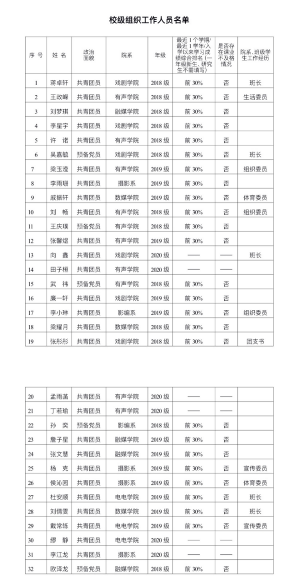 6. 学生会组织工作人员中除一年级新生外的本专科生最近1个学期/最近1学年/入学以来三者取其一,学习成绩综合排名在本专业前30%以内,且无课业不及格情况;研究生无课业不及格情况。 |