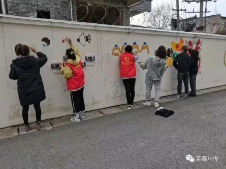 2021年3月2日,在三道堰镇古堰社区居民委员会,川传志愿者走进。川传志愿者们挑选好合适的颜料为墙壁上勾勒好的图形填充色彩,用自己手中的画笔在墙壁上留下自己的对青杠树村的希冀与祝福,为青杠树村的壁画带来生机与活力。