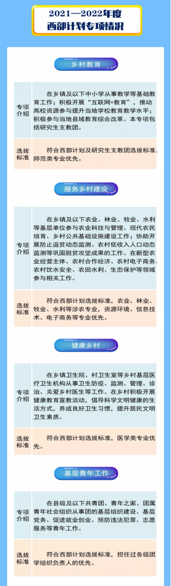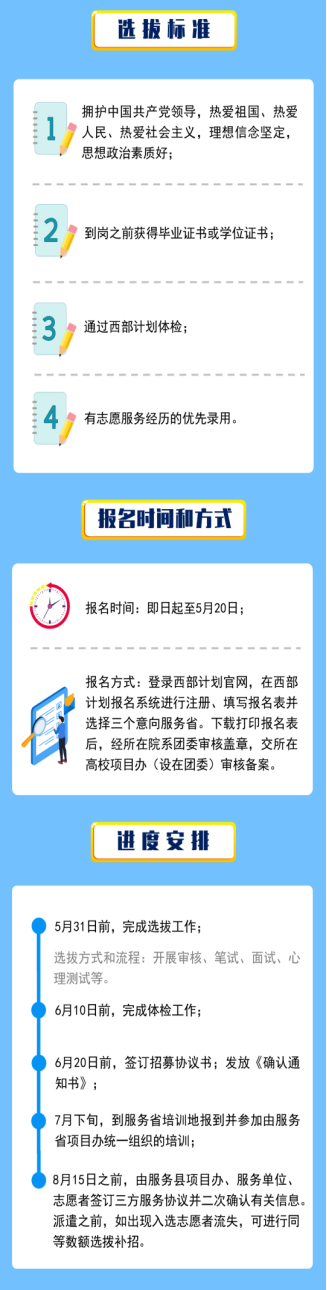 2021年普通高等学校应届毕业生或在读研究生,到岗之前需获得毕业证书或学位证书,且需通过西部计划体检(体检内容和标准见西部计划官网)。