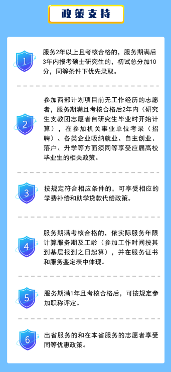 1.研究生考试加分:服务2年以上且考核合格的基层项目人员,在服务期满3年内报考硕士研究生,初试总分可以加10分;