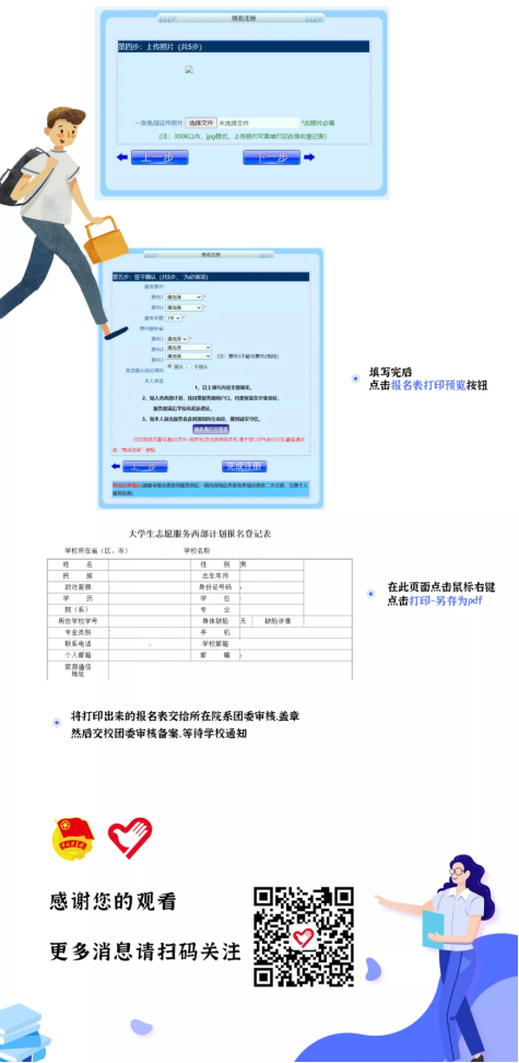 寻找报名入口→进入报名页面→申请注册链接→登录注册邮箱→激活链接地址→填写密码→填写基本信息→填写个人经历→上传个人照片→完成注册→提交纸质报名表经所在院系团委审核盖章,交所在高校项目办(设在团委)审核备案。