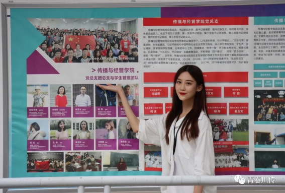 作为本学院团学组织的负责人之一,有很强的组织协调能力,工作中带着无比的积极和认真。她寄语学弟学妹们“愿你们在大学生活中,脚踏实地勤好学,足履大道出人才。做“博学笃行 德艺双馨”的川传人!”