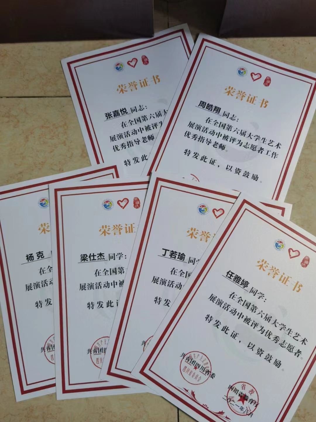 同时,共青团四川省委、四川省教育厅下发《关于表扬全国第六届大学生艺术展演活动志愿者工作优秀组织单位及个人的通知》四川传媒学院团委书记周皓翔、校团委办公室主任张嘉悦等2位老师荣获“优秀指导老师”,杨克、丁若瑜、梁仕杰、任雅婷等4名志愿者荣获“优秀志愿者”。