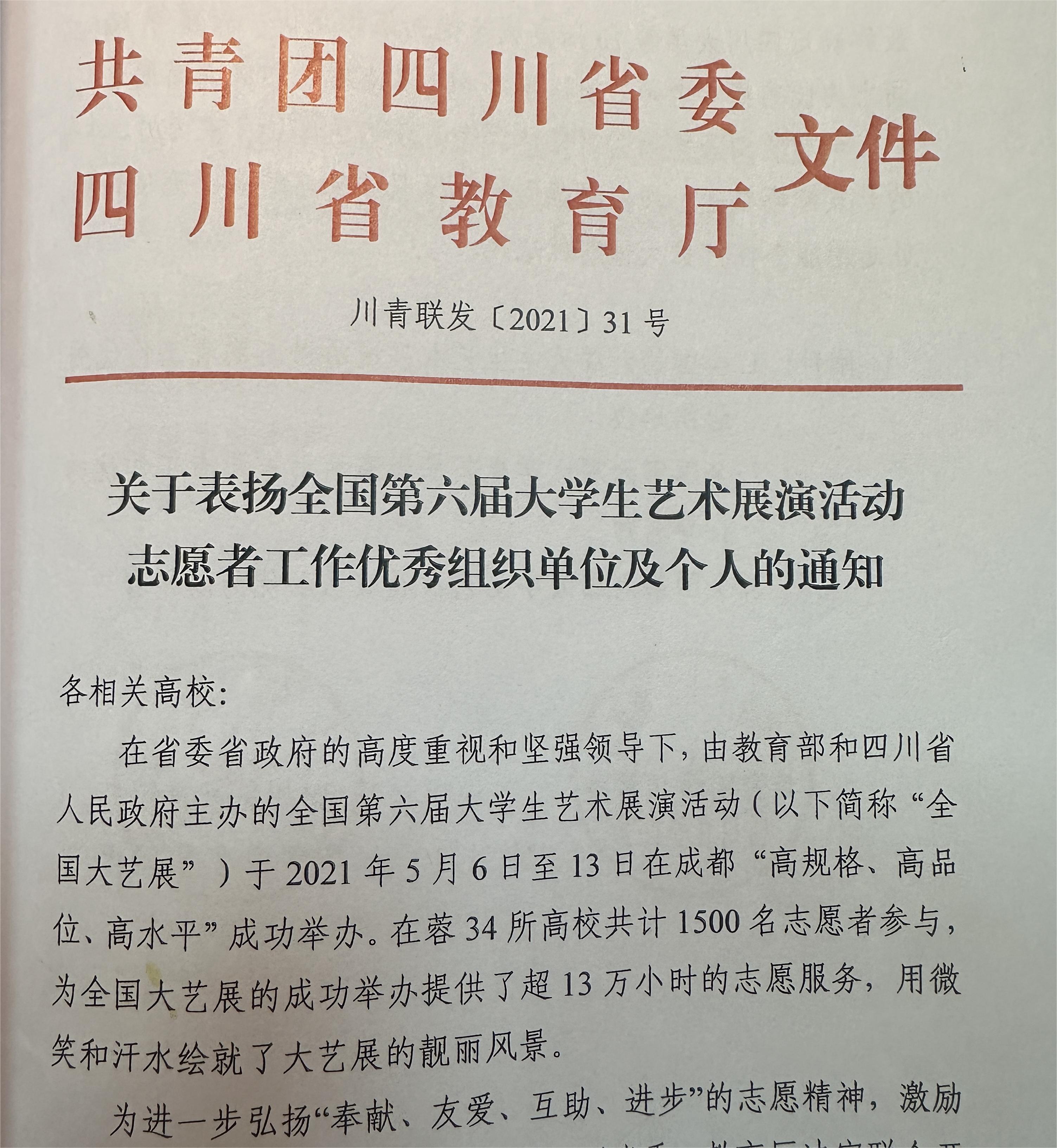 同时,共青团四川省委、四川省教育厅下发《关于表扬全国第六届大学生艺术展演活动志愿者工作优秀组织单位及个人的通知》,我校党委委员、团委书记周皓翔、团委办公室主任张嘉悦等2位老师荣获“优秀指导老师”,杨克、丁若瑜、梁仕杰、任雅婷等4名志愿者荣获“优秀志愿者”。