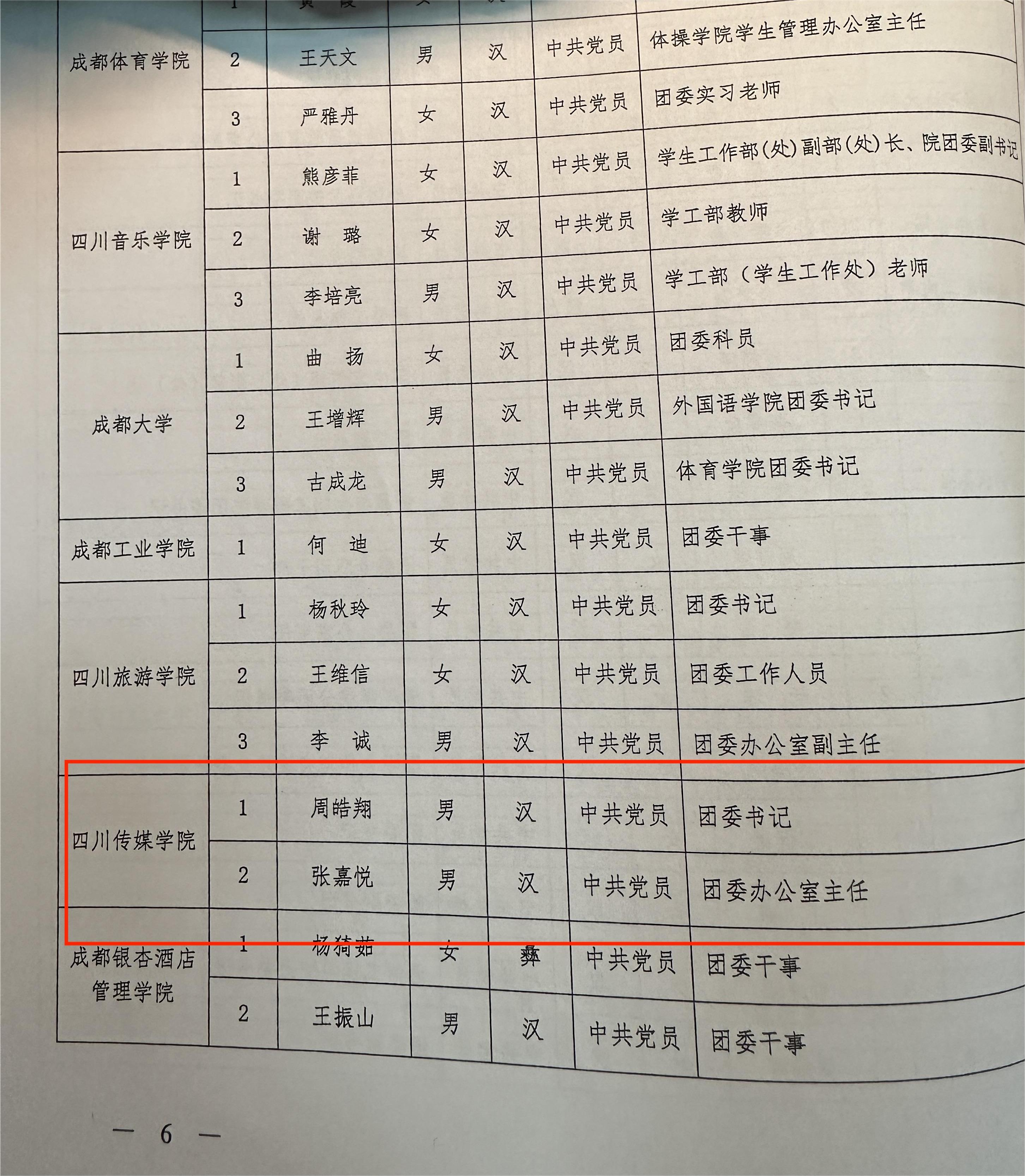 今年5月,由教育部和四川省人民政府主办、教育厅和成都市人民政府承办的全国第六届大学生艺术展演活动在成都市成功举办。根据全国大艺展执委会的工作部署要求,学校高度重视,组织得力,荣获省人民政府表彰的“全国第六届大学生艺术展演活动四川省先进集体”。在活动期间,川传青年以高度的责任心,做好各项服务工作。我校团委书记周皓翔、校团委办公室主任张嘉悦荣获“全国第六届大学生艺术展演活动四川省先进个人”被四川省人民政府发通报表扬