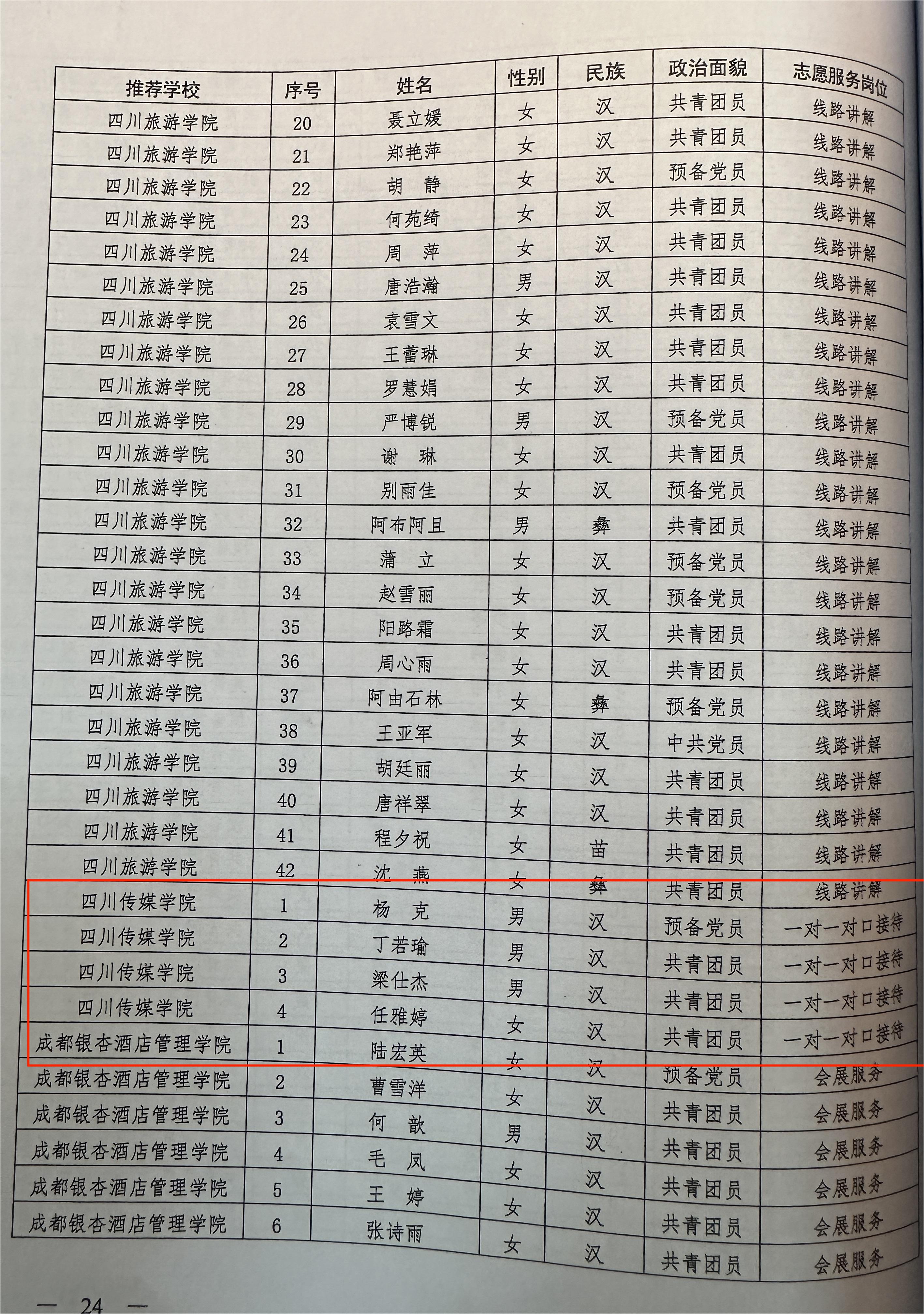 据悉,全国第六届大学生艺术展演活动,由中华人民共和国教育部举办。本次展演活动以“奋斗·创新·奉献”为主题,吸引了来自全国各地198所高校264支代表队,近8600余名师生参加,包括朗诵、乐器、声乐、舞蹈、戏剧展演等。我校青年志愿者参与本次展演活动的一对一对口接待兄弟院校参展队伍的相关志愿服务工作。服务期间,志愿者们认真负责、热情周到,充分展示了我校青年志愿者的良好精神风貌,展现了川传青年的青春志愿风采,获得展演主办方和参展高校代表队师生的高度认可。