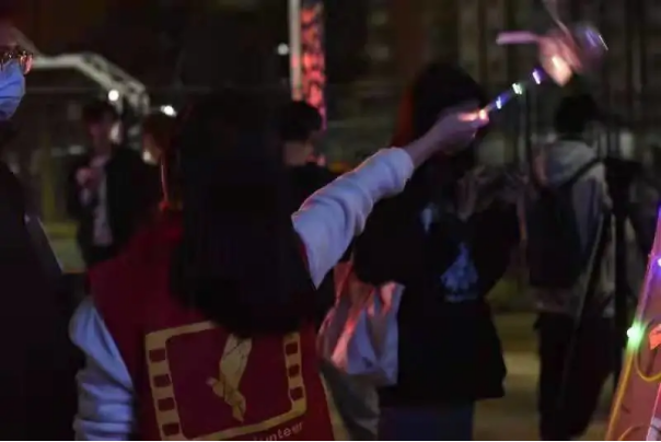 在夜色的最原始画布上,川传师生们挥舞着手中的荧光棒,画出了缤纷的色彩。这是属于他们的荧光记忆,摄影志愿者也用相机,记录下荧光在夜空中留下的影子。