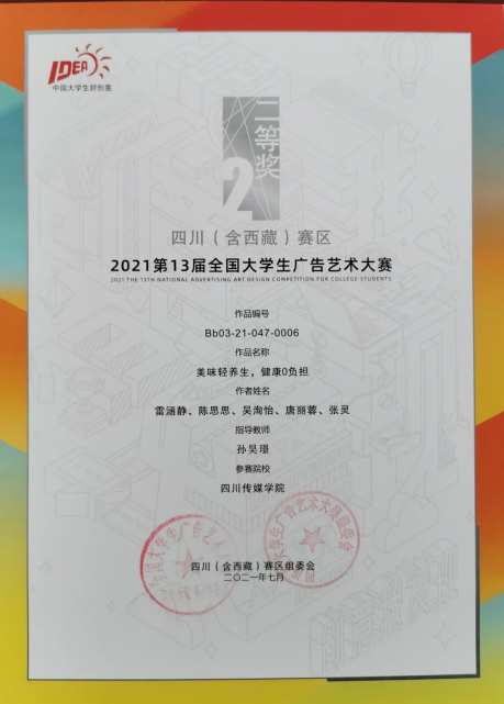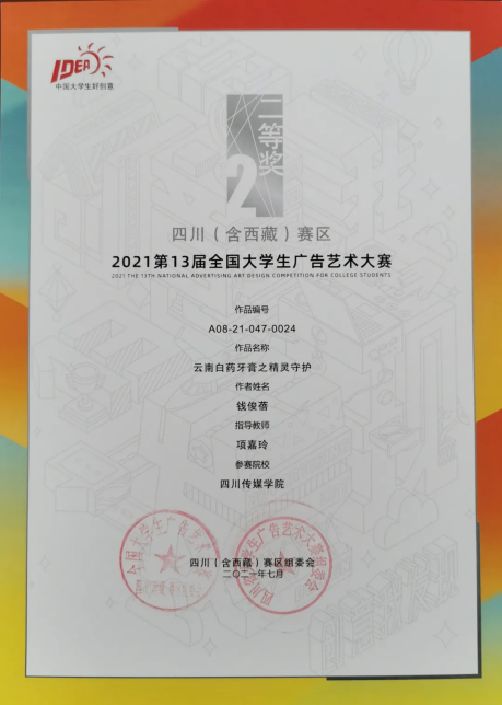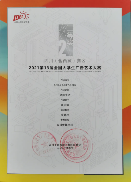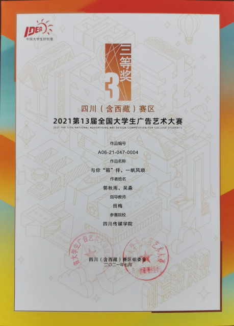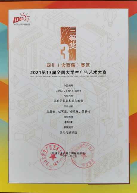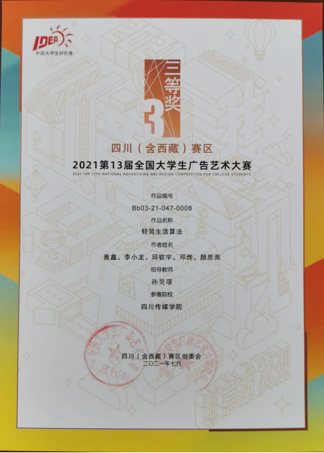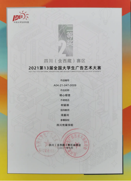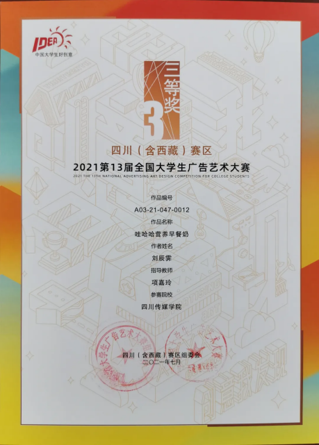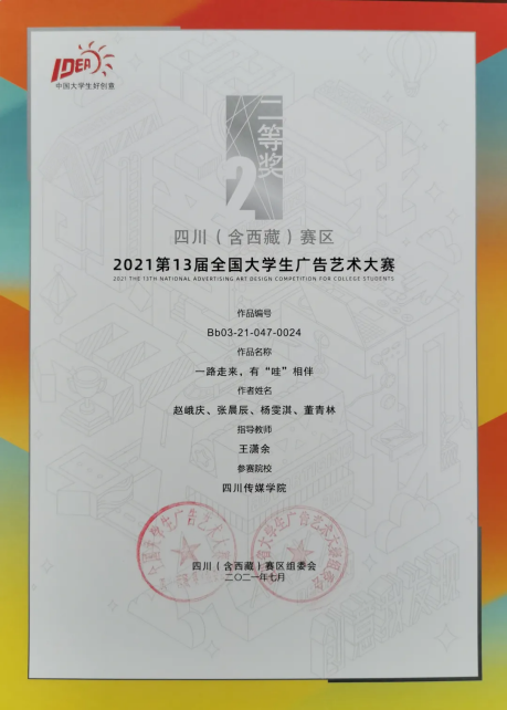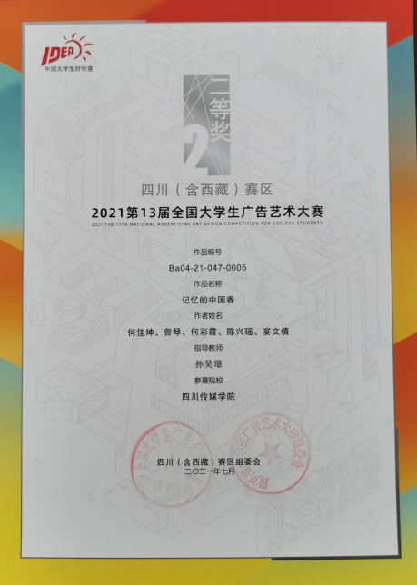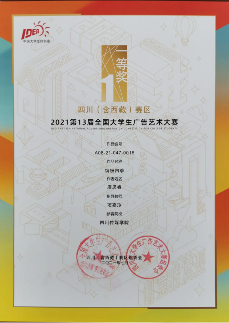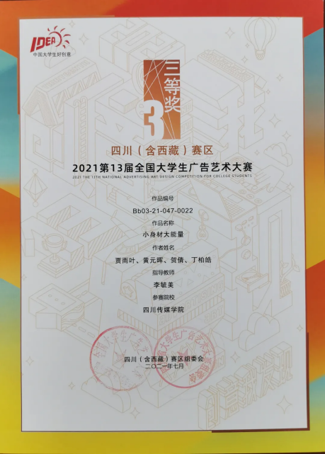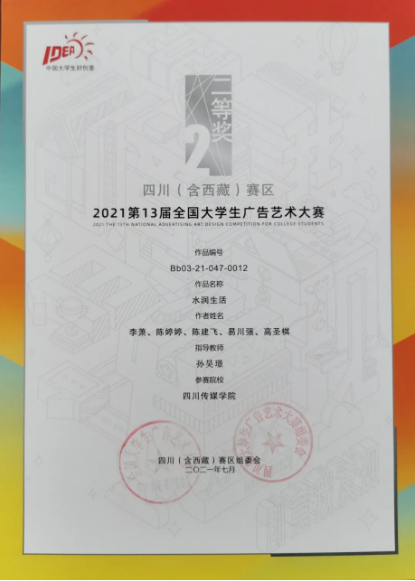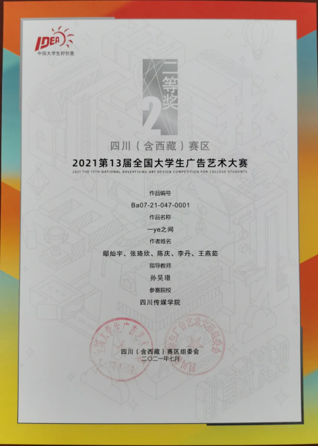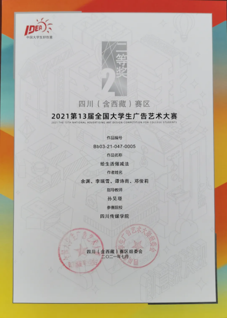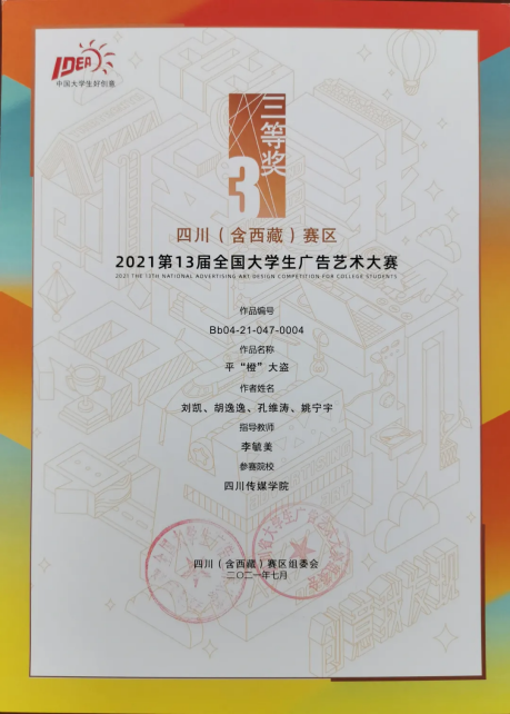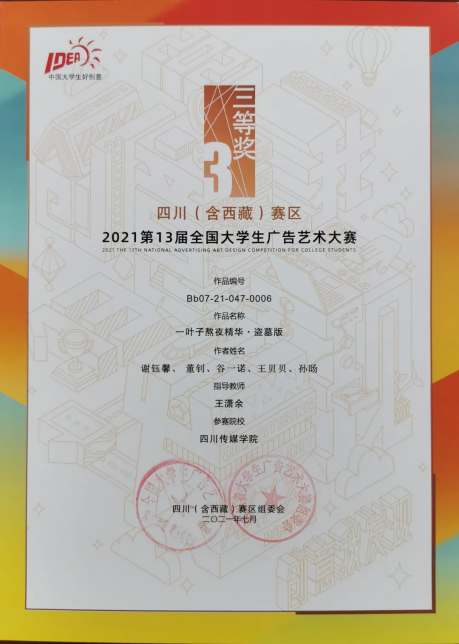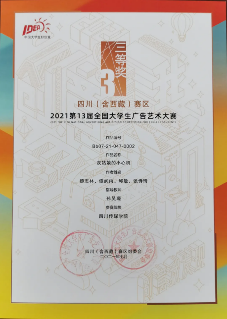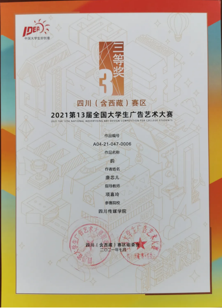 今年的第十三届全国大学生广告艺术大赛四川(含西藏)赛区中,四川传媒学院参赛作品共获得一等奖1个、二等奖10个、三等奖12个、优秀奖12个。