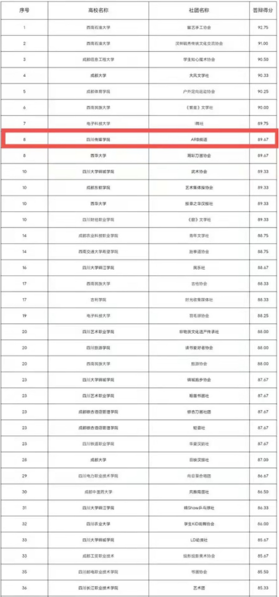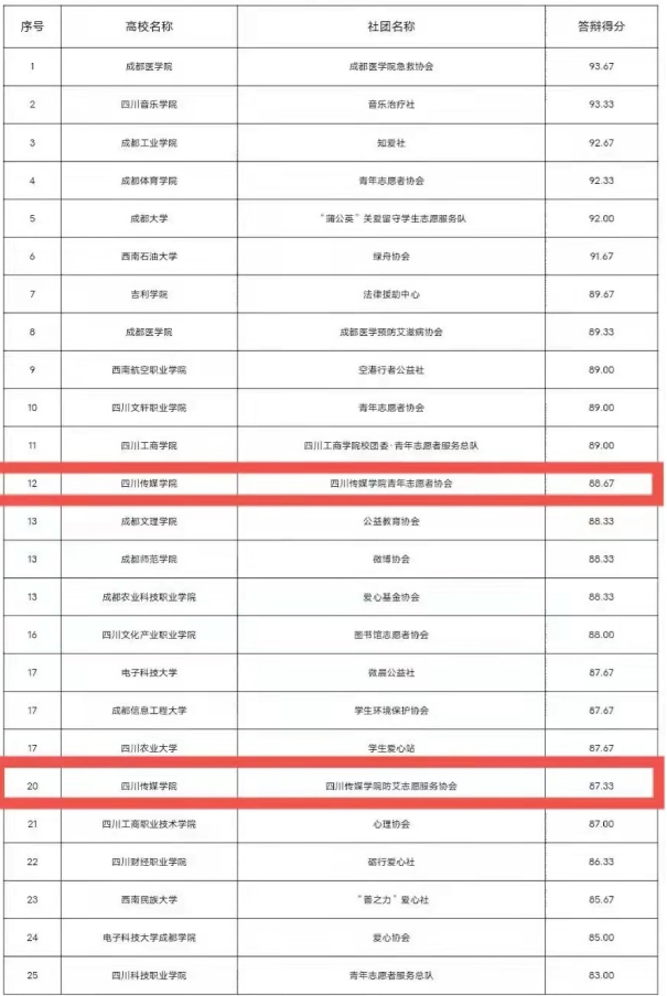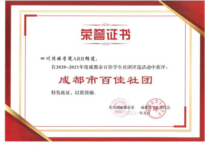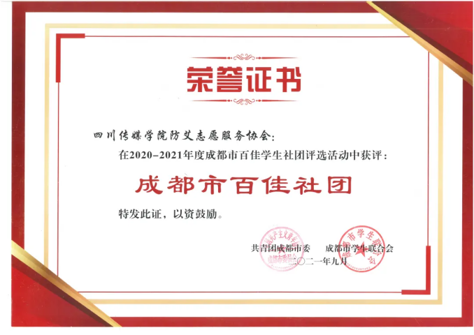 在本次活动中,四川传媒学院的防艾志愿服务协会、志愿者协会、ARB频道荣获“成都市百佳社团”。同时,ARB频道还获得了最佳社团风采奖。