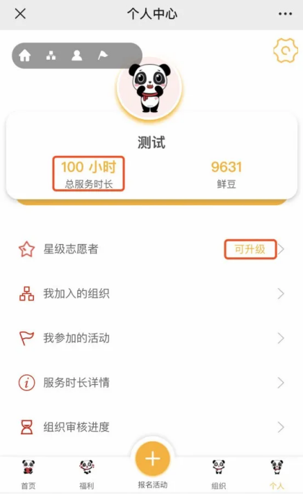 功能介绍:在个人页面查看个人活动时长,当活动时长到达申请升级标准时,会出现“可升级”。