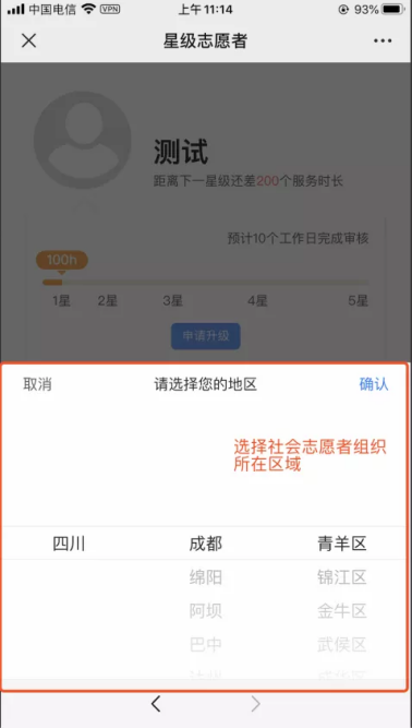Step3:点击“申请升级”后等待组织审核,审核通过后即被评为该星志愿者(高校志愿者、中小学志愿者、省直机关直属志愿者无需选择所在区域,“社会志愿者”在第一次申请星级志愿者评定或申请未通过时,需要选择自己所属组织机构所在地区后方能进行评定);