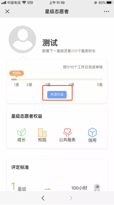 Step2:进入个人页面,当志愿者活动时长到达可升级星级标准时,在“星级志愿者”处会出现“可升级”按钮,点击进入申请页面;
