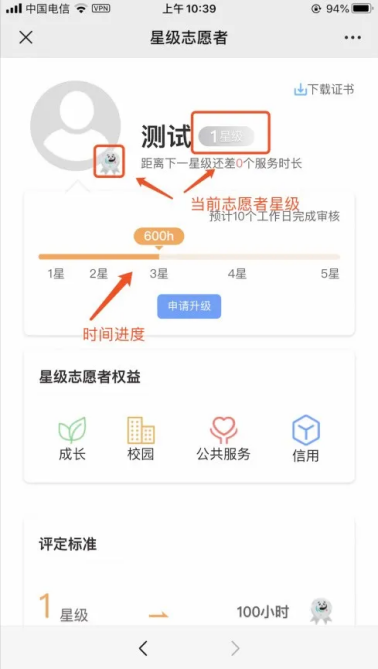 Step4:当志愿者申请通过后,可在右上角查看自己的星级志愿者证书,长按可下载。页面中显示离下一级星级志愿者还差多少时长。头像旁也会显示当前星级志愿者等级。