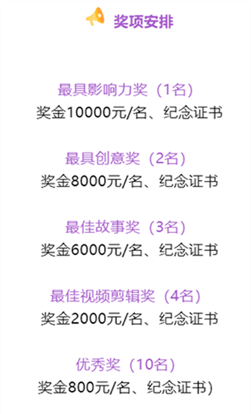通过初审的30个作品将会进入终评阶段,专家评审将根据入选作品的主题吻合度、视频创意度、制作专业度进行综合打分,最后胜出的选手将获得以下奖励,敬请关注!