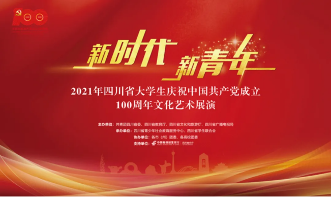为庆祝中国共产党成立100周年,由共青团四川省委、四川省教育厅、四川省文化厅和旅游厅、四川省广播电视局联合主办了“新时代·新青年”2021年四川省大学生庆祝中国共产党成立100周年文化艺术展演(省级展演)。
