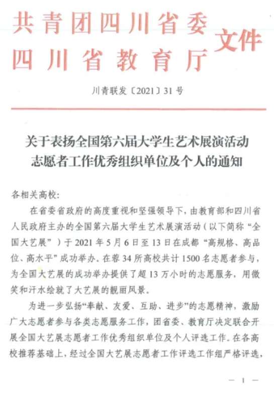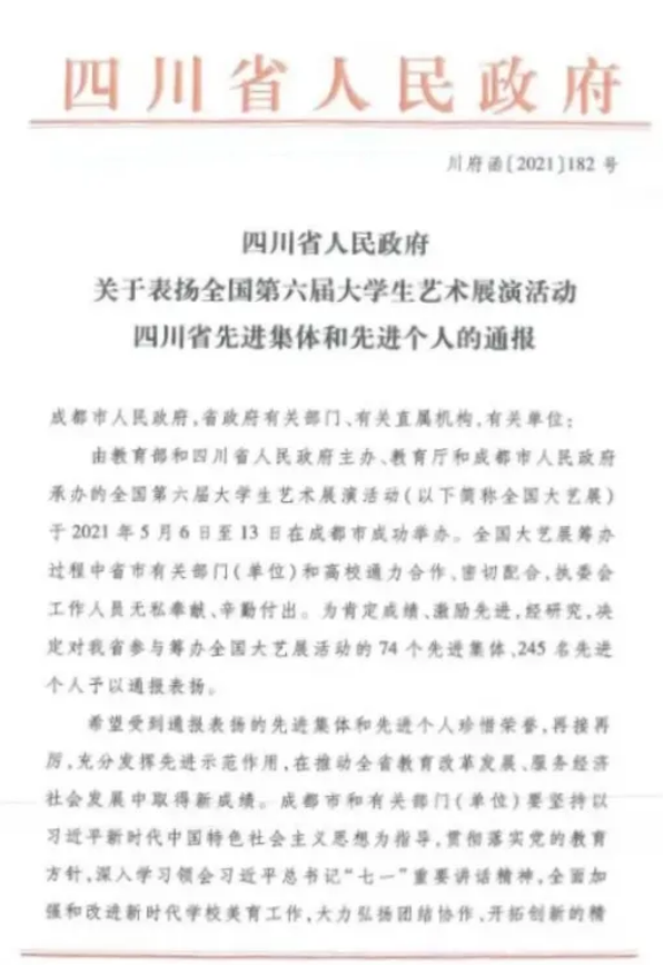 9月16日,四川省人民政府发出关于表扬全国第六届大学生艺术展演活动四川省“先进集体”和“先进个人”的通报,四川传媒学院获得"先进集体"称号。