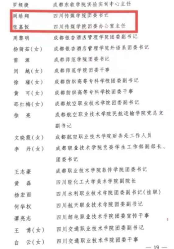 今年五一期间,校团委书记带领学校团委教师和十余名学生志愿者参与到全国第六届大学生艺术展演活动的对口接待工作当中,受到组委会肯定和赞扬,展现了四川传媒学院良好的精神风貌。除学校获得先进集体外,周皓翔、张嘉悦等老师还获得了先进个人称号,其工作团队的成员还获得了团省委和教育厅联合颁发的优秀志愿者指导教师和优秀志愿者等荣誉。