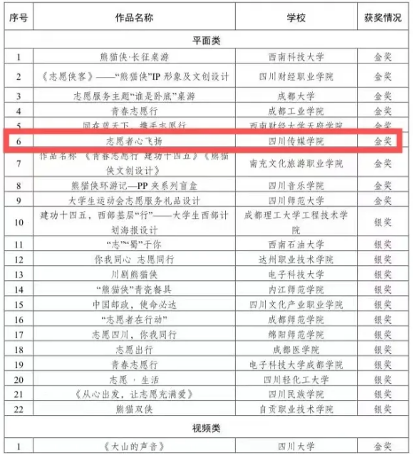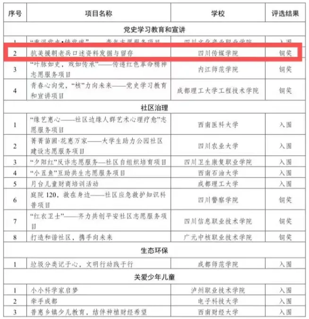 四川传媒学院团委推报的创投项目——《抗美援朝老兵口述资料发掘与留存》获铜奖,文化产品设计作品——《志愿者心飞扬》获金奖。