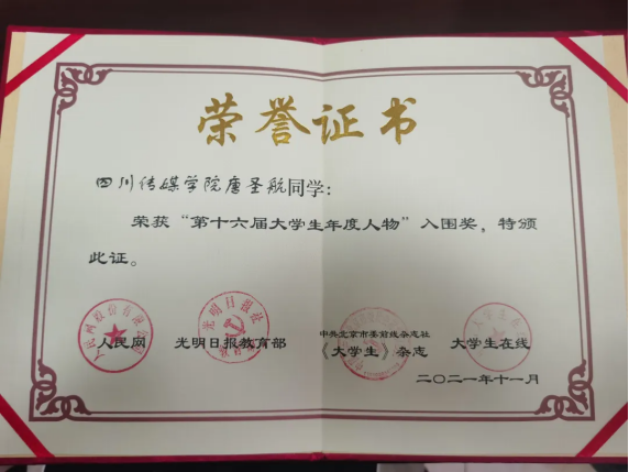 唐圣航,四川传媒学院编导艺术学院2019级学生,“第十六届大学生年度人物”推选活动入围奖。