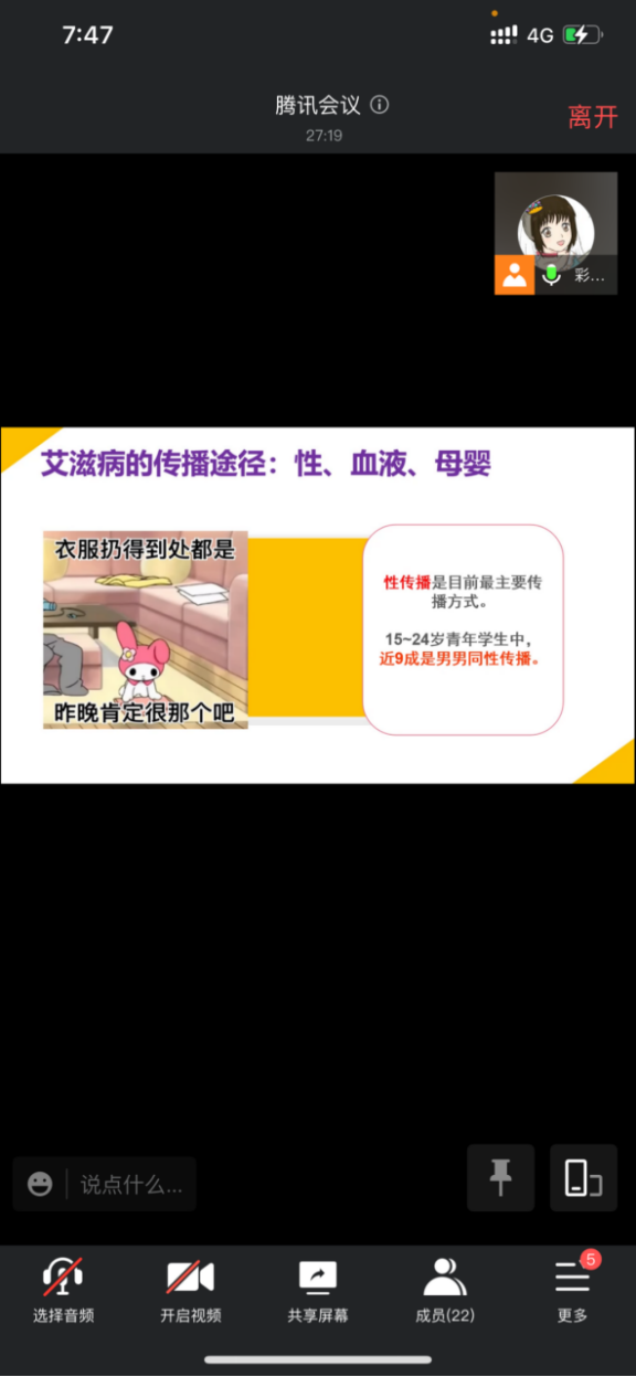 为保障全体师生身心健康,防止艾滋病蔓延和流行,纠正不良生活习惯和不健康行为,发挥法制宣传在艾滋病防治工作中的教育引导作用,增强广大师生的防范意识。2022年4月15日及4月22日晚上19:30,由于疫情防控影响,四川传媒学院防艾志愿服务协会联合成都艾青春两次为300余名学生进行了防艾知识讲座。