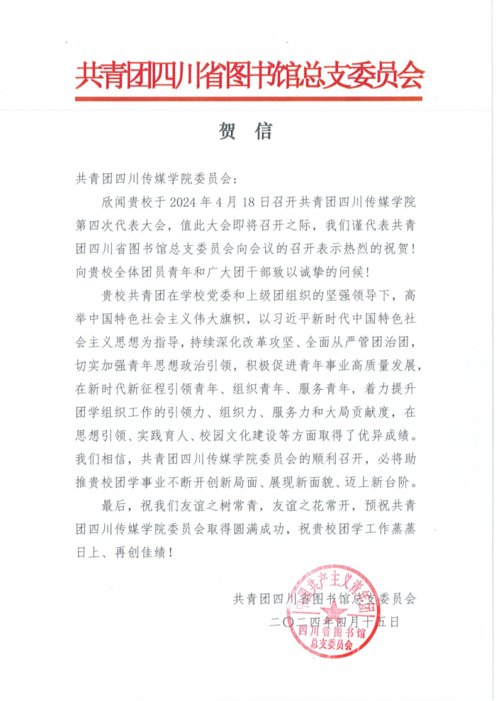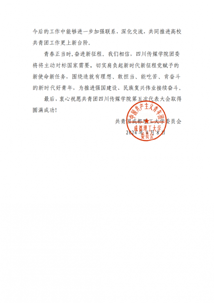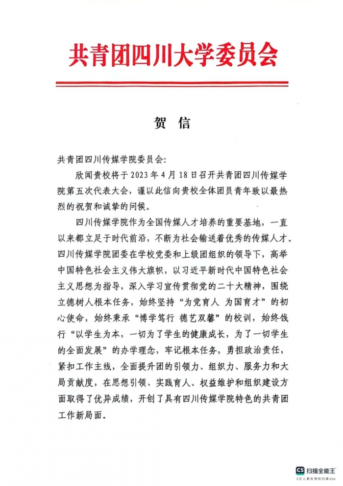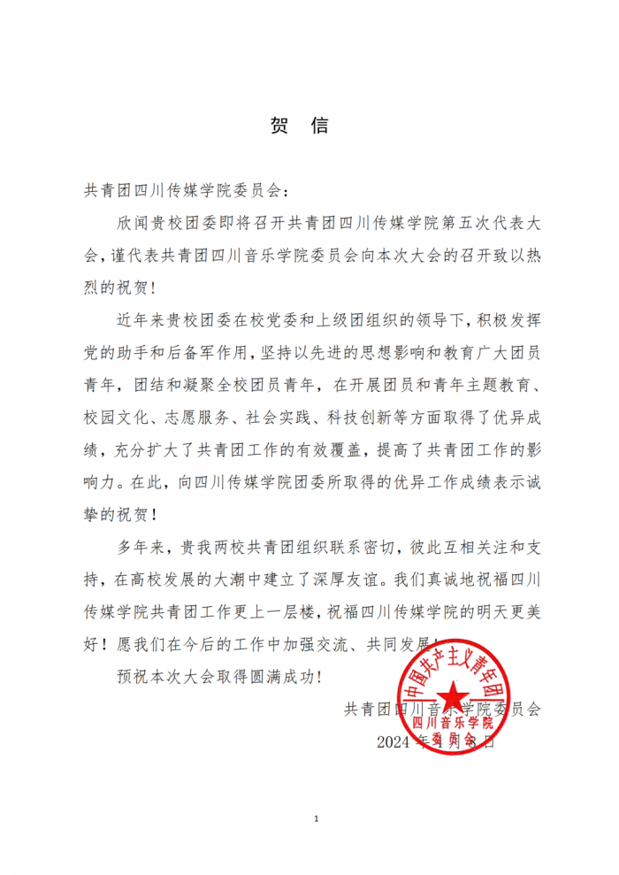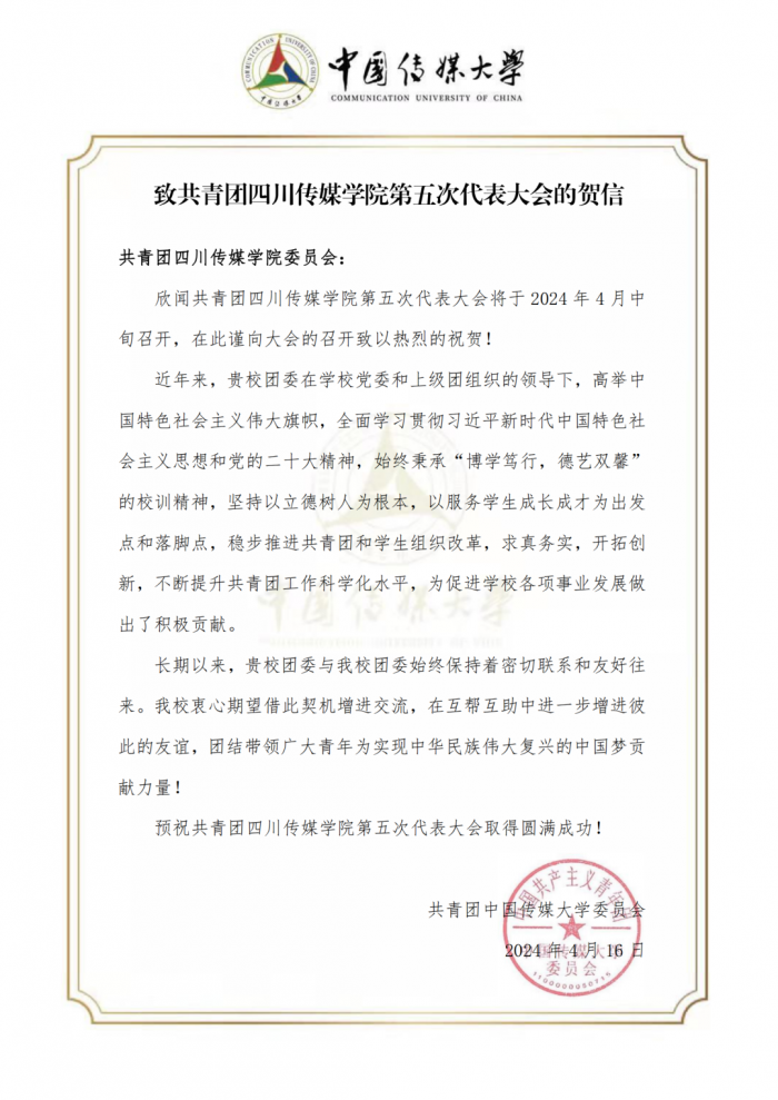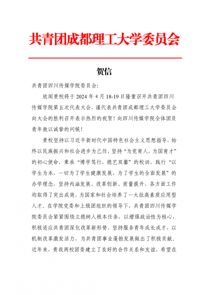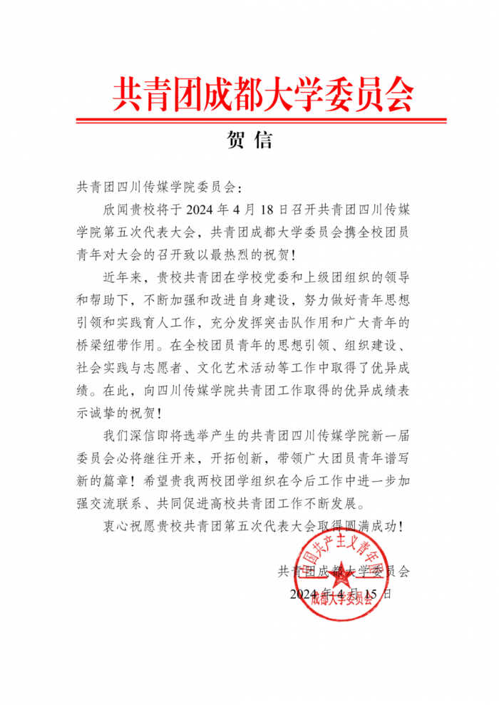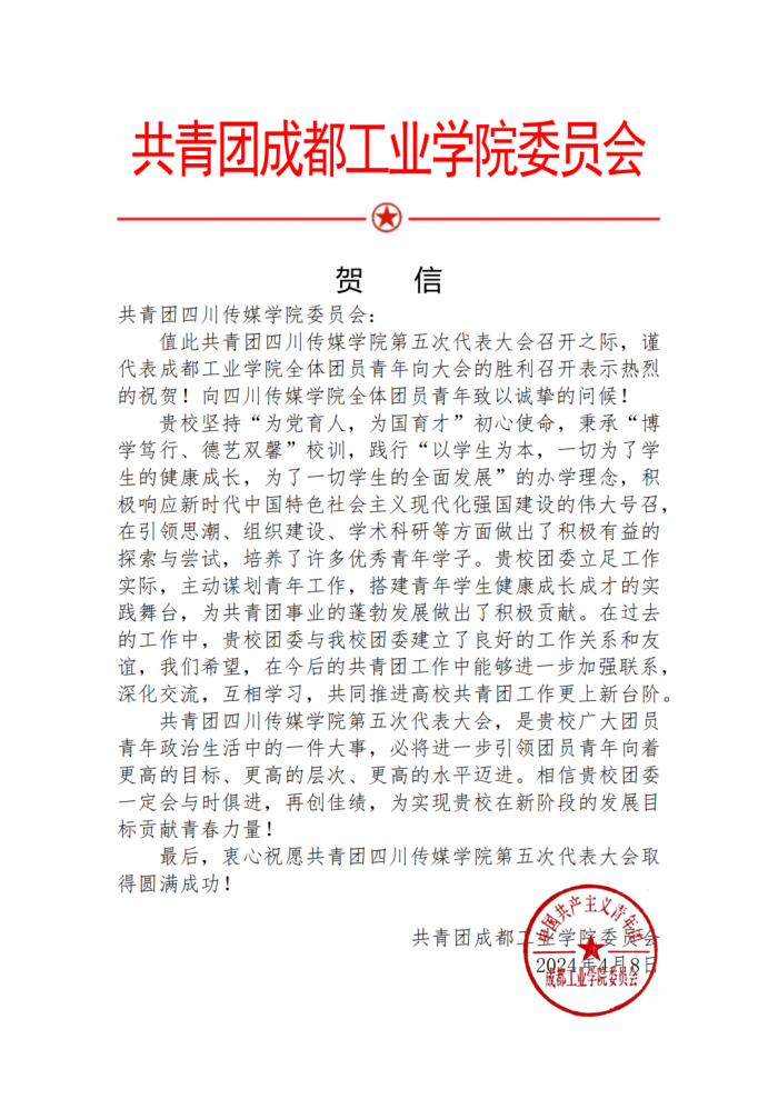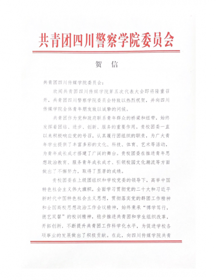 在学校第五次团代会筹备期间,共青团四川传媒学院委员会收到了各兄弟院校及合作单位团委发来的贺信。