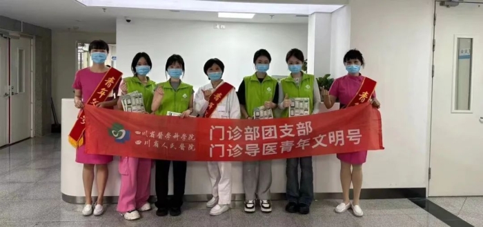 图为志愿者与四川省人民医院门诊支部负责人合影