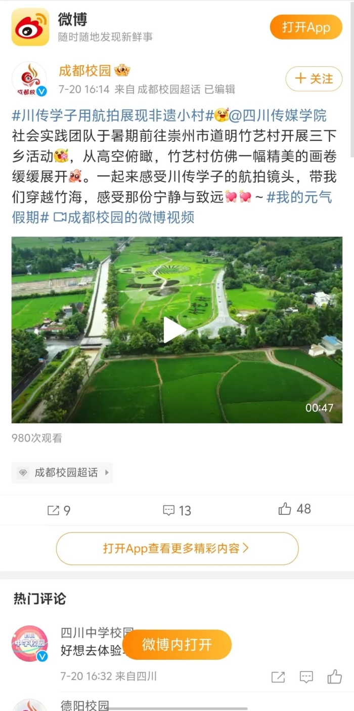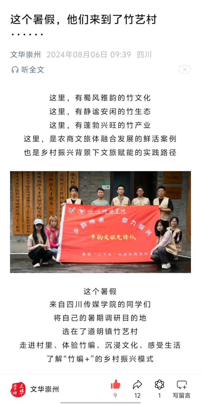 实践结束后,我们向崇州文旅局和道明镇政府提供素材,以助力宣传工作,希望通过我们的努力,能够为竹艺村的宣传工作贡献一份力量,吸引更多的人关注竹艺村,投资竹艺村,共同推动竹艺村的发展与振兴。