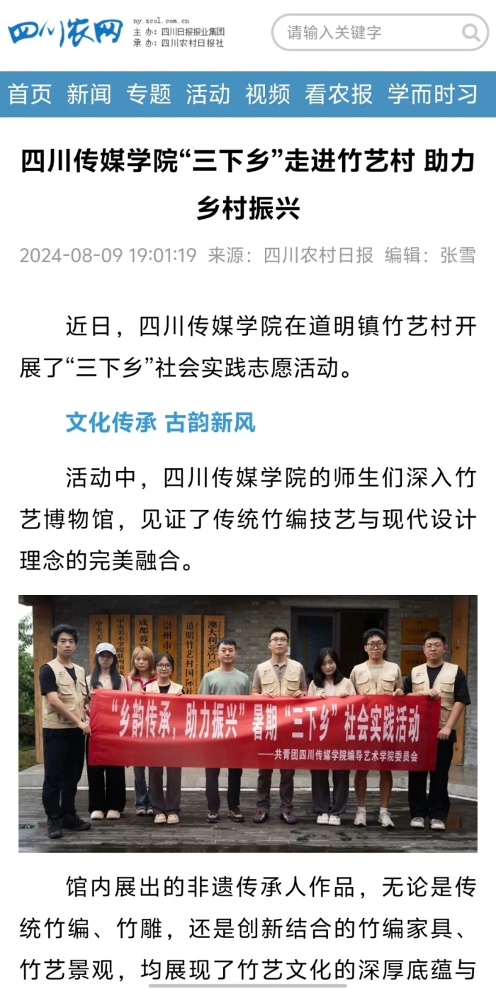 2024年7月初,四川传媒学院乡韵文旅先锋队前往崇州道明镇竹艺村进行暑期“三下乡实践活动”,用脚步丈量祖国土地,勾勒沃野千里的振兴画卷,用真心传递温暖,促进非遗创造性转化与新时代发展,江山留胜迹,贡献青春力量,我辈复登临,书写青春担当。
