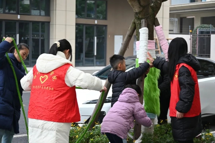 为了保护街道树木不受寒冷气候的影响,强调保护自然的重要性。近期,郫都区图书馆嘉祥瑞庭熙岸服务点联手传播与经管学院传大爱青年志愿者协会,举办了充满温情的“童心筑梦公益行”志愿服务实践教育活动,40名志愿者来到嘉祥社区,和小朋友们共同投身于为大树提供“保暖”层的冬日实践活动中。